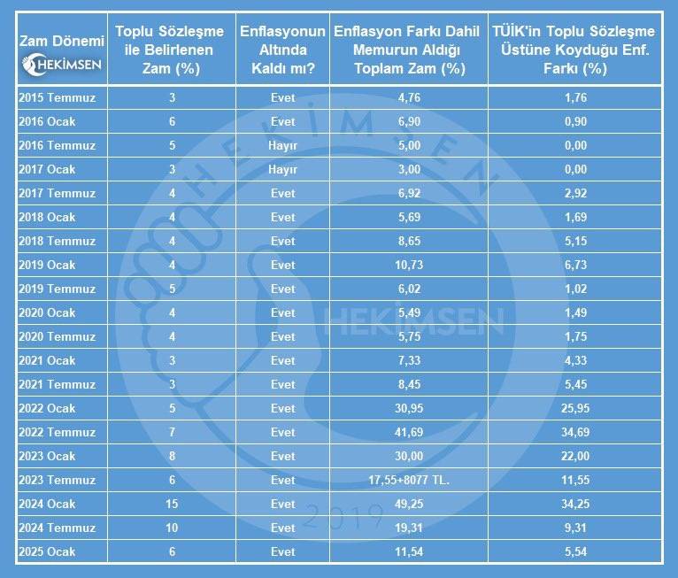 Hekim Sen tarafından konuyla ilgili şu açıklama yapıldı, “2Yetkili sendikanın toplu sözleşme masasında kabul ettiği zamlar, son 10 yılda enflasyonun gerisinde kalmış, maaşlarımız her geçen yıl erimiştir. İşte acı gerçekler ekte ki görselde !!  Enflasyon farkı zam değildir! Enflasyon farkı, maaşların alım gücünü korumak için yapılan bir telafi ödemesidir. Gerçek zam ise, maaşların enflasyonun ötesinde artırılması ve refah seviyesinin yükseltilmesi demektir. Kaybı telafi etmek başka, maaşı iyileştirmek başkadır!  Memurlar her geçen gün daha da fakirleşiyor! TÜİK’in güvenilirliği tartışmalı enflasyon verileriyle yetinmek zorunda bırakılan memurlar, hak ettiği zammı alamamaktadır. Yetkili sendikanın masadaki varlığı, çalışanların lehine bir sonuç üretmiyor! Memur kardeşlerimiz! Masa başında memurlar için mücadele etmeyen, yetkisini üyeleri için kullanma becerisini gösteremeyen sendikalara üyeliğinizi devam ettirerek hem kendi haklarınızın, hem de diğer memurların haklarının yenilmesine daha ne kadar göz yumacaksınız?  Artık yeter! Hekimsen olarak, memurların gerçek haklarını savunmak ve toplu sözleşme masasında güçlü bir şekilde temsil edilmek için yetki istiyoruz. Güçlü altyapımız ve dik duruşumuzla sizin sesiniz olmaya hazırız!  Gerçek zammı almak için birlikte mücadele edelim” (BSHA – Bilim ve Sağlık Haber Ajansı)