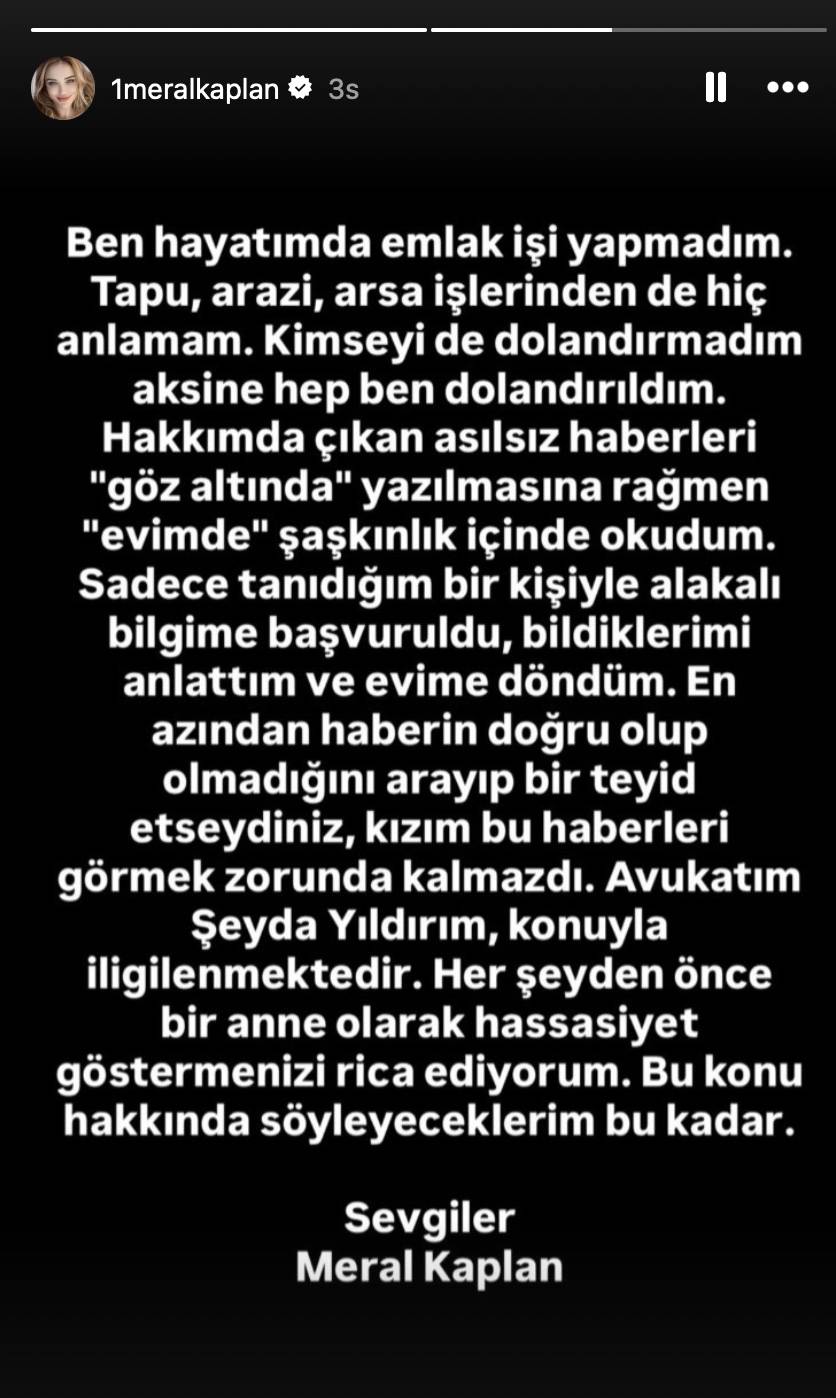 Gözaltı iddialarının ardından sosyal medya hesabından bir açıklama yapan Meral Kaplan, iddiaları sert bir dille yalanladı. Kaplan, hiçbir zaman emlak işiyle ilgilenmediğini ve kimseyi dolandırmadığını belirterek şu ifadeleri kullandı: